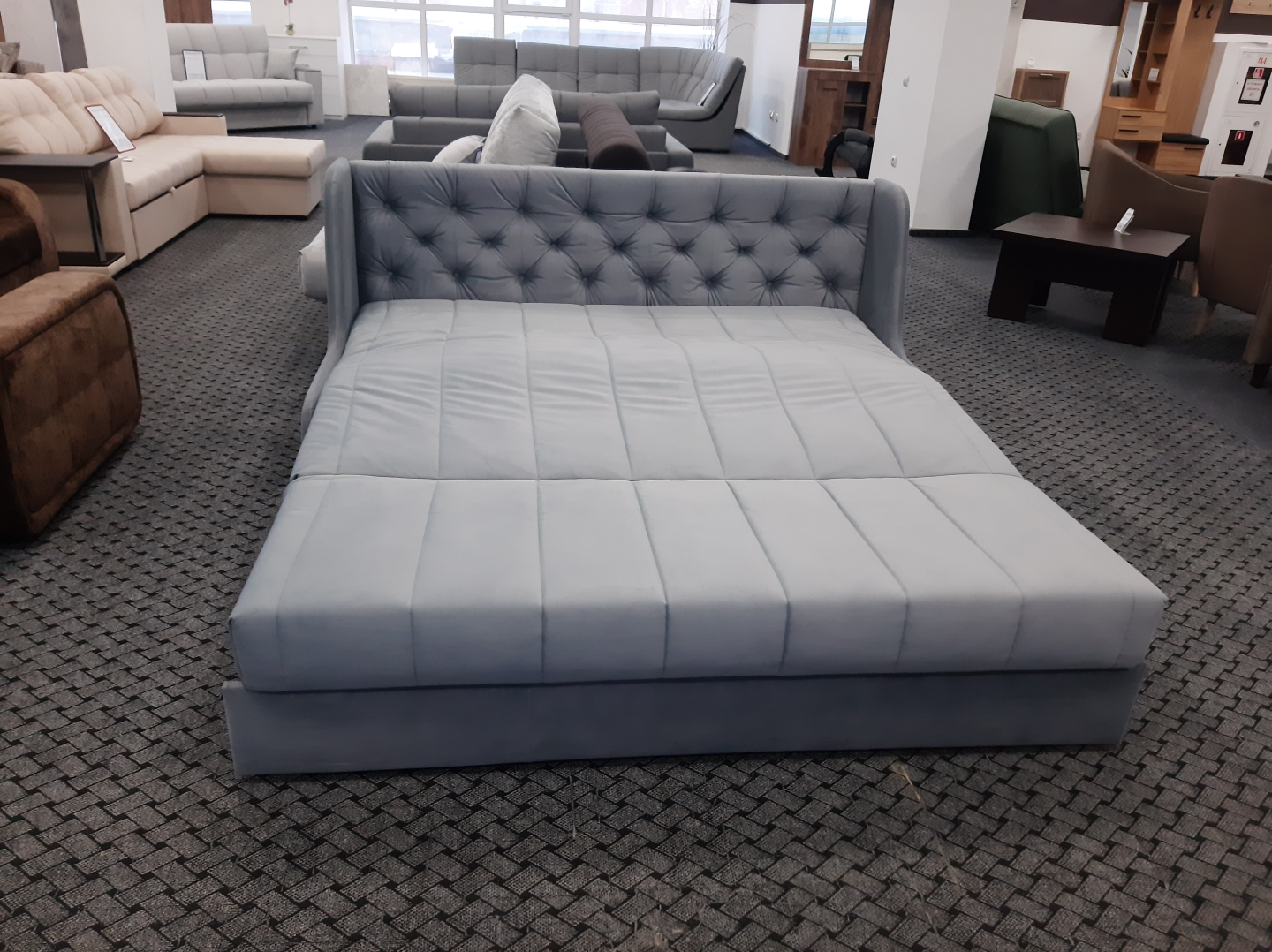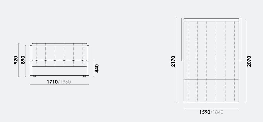 Скругленные углы фальшпанелей, заменяющие подлокотники, делают его безопасным и экономят место, а высокая спинка с  декоративными утяжками в разложенном виде становится элегантным изголовьем кровати. Ровное и просторное спальное место без стыков оснащено независимым пружинным блоком, что сделает сон максимально комфортным.
